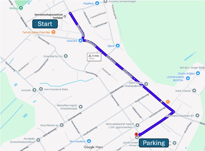 Vanaf dit jaar gaan we gebruik maken van een nieuwe overdekte parking voor wagens gelegen in de Jacob Lenaertsstraat. Hierbij een plannetje voor afstand parking naar vertrekpunt in Gemeenschapscentrum Tentakel